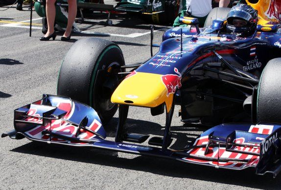Pirmą kartą apie „Red Bull“ suteikia sparnu-u-us“ priemonę buvo užsiminta Vokietijos GP metu, kai vienas toks žurnalistas S. Samsonas ir kitas toks fotografas D. Heathas pateikė daug foto, kuriuose matėsi buliukų priekinių sparnų judėjimo amplitudė. Vėliau buvo pateikti ir vaizdo kadrai „onboard“.