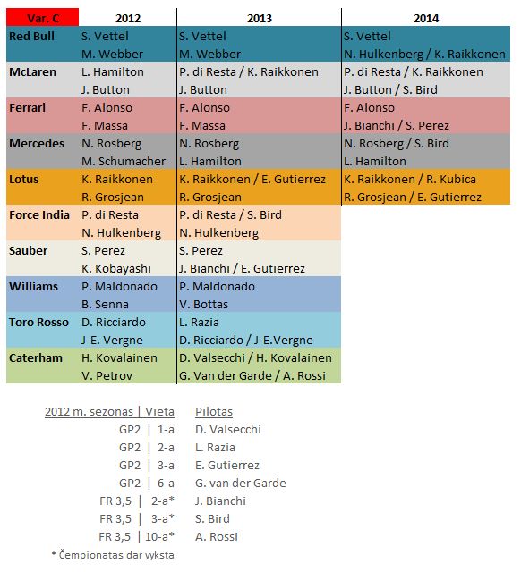 „Ferrari“ – niekas nesikeičia. Massa nelabai tinka, bet jei pamastom – nėra geresnių alternatyvų „greitųjų, bet nelabai“ pilotų tarpe. Bianchi arba Perezas gali būti, bet vėliau. Nors kol kas neaišku ar Massa lieka ar ne. Bet aš palikčiau. Toks Irvine-Barrichello visai neblogas iš jo gaunasi… Rizika čia viena – jei paliekam Massą 2013-iems, privalu palikti ir 2014 m. (dėl naujo techninio reglamento). Kitaip būtų protinga jau 2013 turėti kitą lenktynininką, su kuriuo kartu būtų patogiau pereit prie 2014-ųjų. Beje, tokiu lenktynininku matau Nico Hulkenbergą.