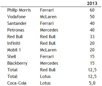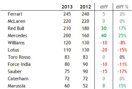 Dabar šiokia-tokia įdomybė F-1 finansų srityje – komandų biudžetai (mln. EUR) ir jų palyginimas 2013 vs 2012 (žr. lentelę).