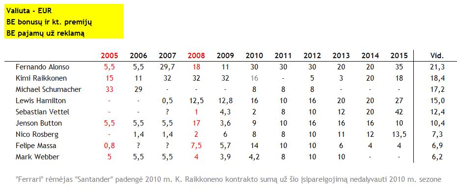 | Raikonenas – 26 mUSD maksimali suma per metus, kartu su bonusais (2014-2015)