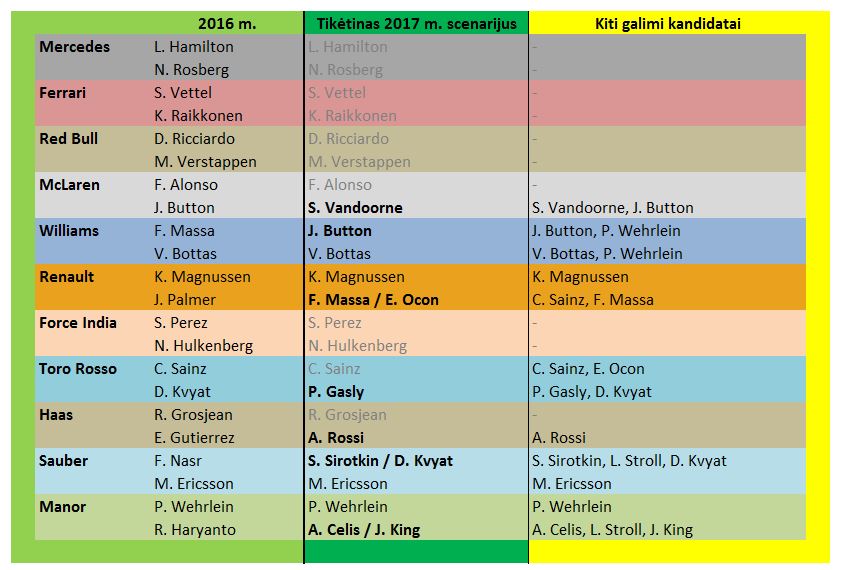 Šiame sąraše tikras savo vietos yra nebent Grosjanas (“Haas”) ir kažkiek Magnussenas (“Renault”), o visi kiti “Sauber”, “Manor”, “Haas” ir “Renault” pilotai gali tikrai pasikeisti.