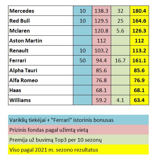 - Panaikintos specialios „Mercedes“, „Ferrari“, „Red Bull“, „McLaren“, „Williams“ premijos*