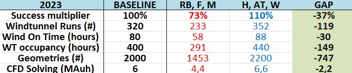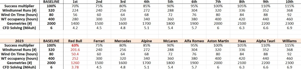 Beje, už praeitais metais naudojimosi vėjo tunelyje ribų viršijimą, „Red Bull“ buvo nubausta piniginę baudą bei papildomai 10% sumažinti visų aukščiau išvardintų parametrų dydžiai, todėl „Success multiplier“ šiai komandai yra ne 70%, o 63%.