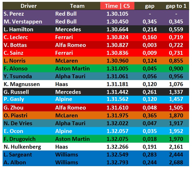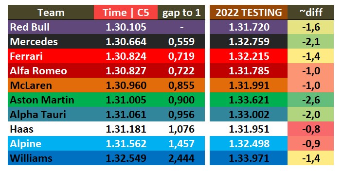 NB Fernando Alonso („Aston Martin“) laikas paskutinę bandymų dieną buvo užfiksuotas C4 padangomis, bet, atsižvelgus į aukščiau minėtus koeficientus, lentelėn pateko jo ankstesnis rezultatas, važiuojant C3 mišiniu. Skaičiuojant pagal C5 gaunasi, jog ankstesnis ispano laikas yra greitesnis.