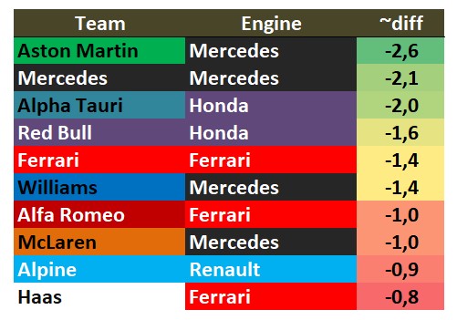 Tai leidžia išvysti kuri ekipa labiausiai pagreitėjo. Ryškiausiai „žaliuoja“ jau minėta „Aston Martin“, o lentelės apačioje vėl matosi „Alpine“ bei „McLaren“.