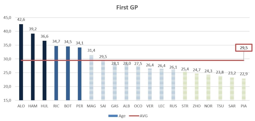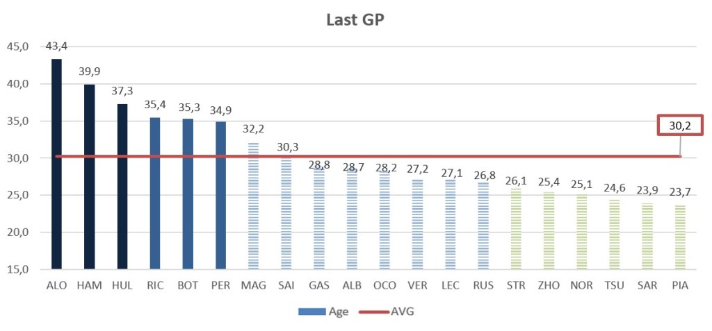 Pilotų amžiaus vidurkis vėl muša rekorduis – šis skaičius šįmet yra 29,5 metų sezono pradžioje ir 30,2 metų jo pabaigoje. Didžiausią įtaką tam ir vėl turėjo Fernando Alonso bei Lewis Hamiltonas (“Mercedes”), sezono gale jam bus bemaž 40 metų.