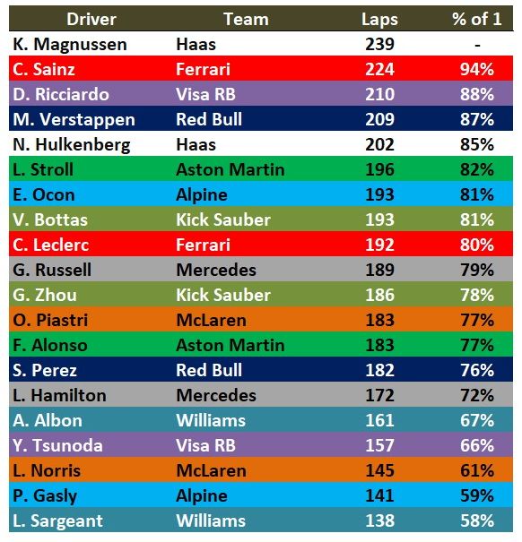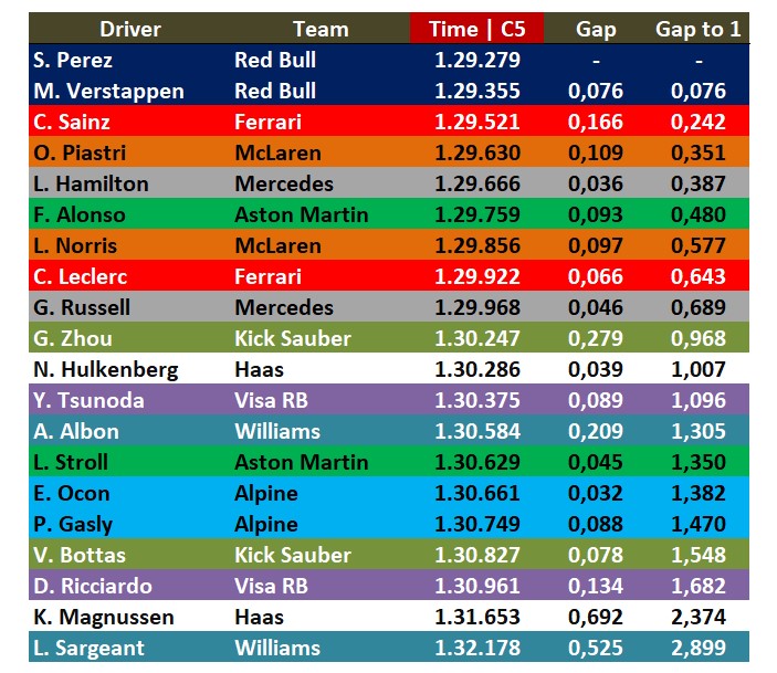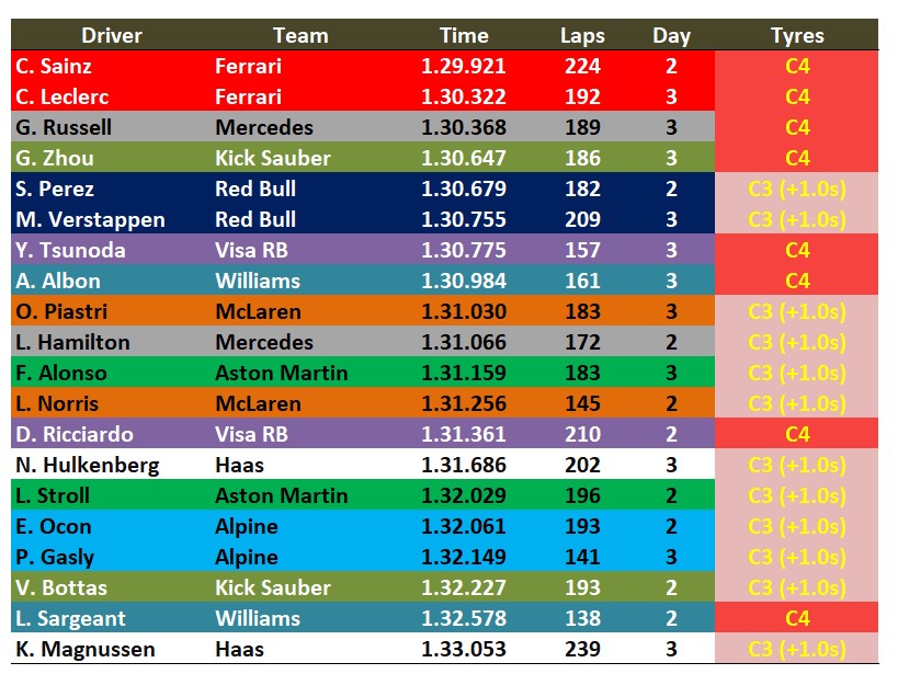 Geriausius rezultatus užfiksavo abu „Ferrari“ pilotai. Šiandien (ir bendrai per tris dienas) – Carlos Sainzas, vakar – Charles Leclerc. Toliau sekė George Russell iš „Mercedes“, tuomet šoktelėjęs į top‘ą Guanyu Zhou („Kick Sauber“), bei abu „Red Bull“ pilotai. Toliau už jų – Yuki Tsunoda iš „Visa RB“, Alexas Albonas iš „Williams“, Oscaras Piastri iš „McLaren“, ir dešimtuką uždarantis Lewis Hamiltonas („Mercedes“).