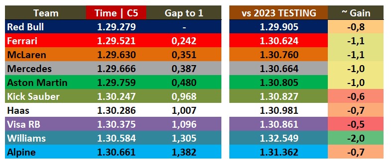 Toliau, pasižiūrėkime į komandų pajėgumus, imant geriausią kiekvienos ekipos rezultatą, bei palyginkime su tos pačios ekipos praeitų metų testų Bahreine geriausiais laikais.