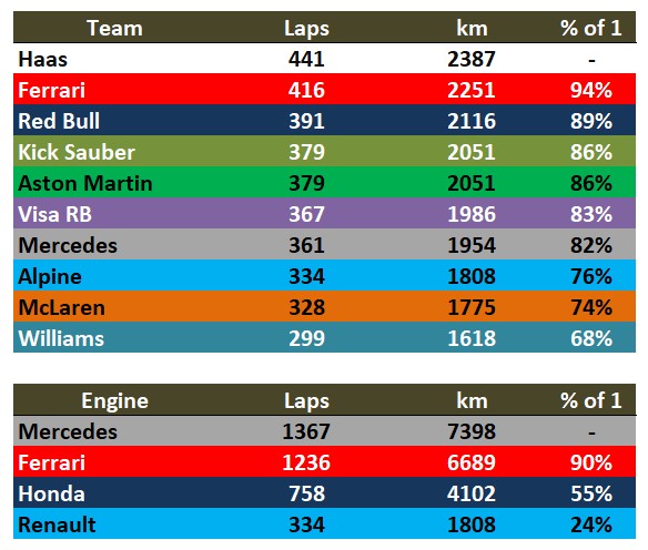 Tradiciškai, šiek tiek statistikos apie įveiktas distancijas – komandų ir variklių: