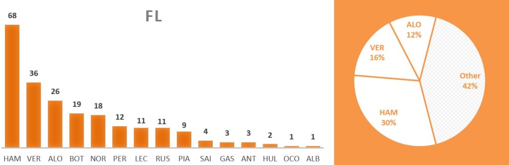 Panaši situacija su “Fastest Laps”, kur lyderiauja Hamiltonas (30% FL), bet Verstappenas ir kiti pilotai lipa jam ant kulnų.