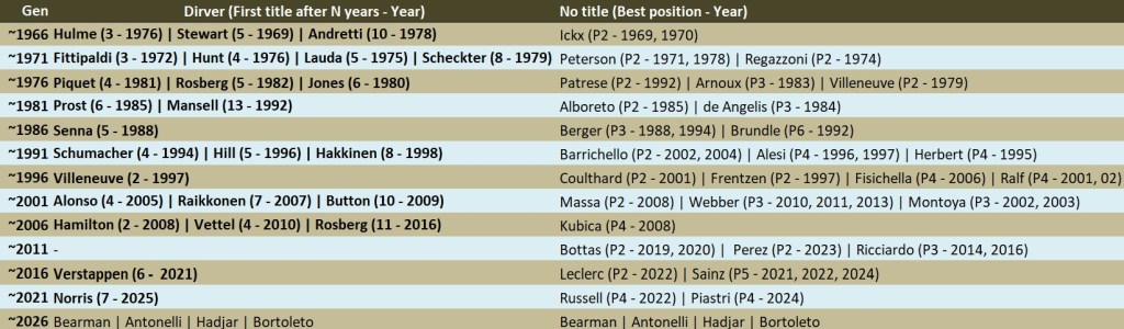 Čia vis dar tas pats hipotetinis sąrašas apie F1 lenktynininkų kartų (generations) kaitą kas penkmetį. Jame matome dominuojančių pilotų tendenciją – Sennos, Vettelio, Verstappeno aukso eroje kitiem tiesiog nebuvo jokių šansų pasireikšti.